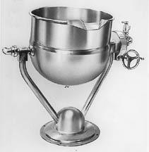 | Tilting kettles are designed for products with a high viscosity. Direct steam, 2/3rd jacketed. Inner shells are T-316 stainless steel with T-304 outer jacket shells. Self-locking worm gear tilt mechanism. Operating pressure of 30 psi. Available pedestal-mounted or on a tri-legged stand. |